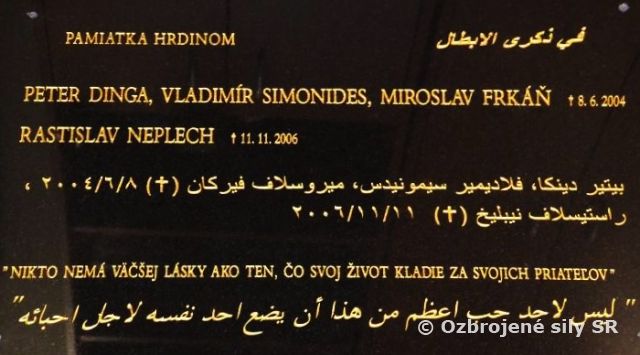 K vojenským pamätníkom a pamätným tabuliam pripomínajúcim padlých slovenských vojakov pribudla 4. septembra 2012 ďalšia, ako miesto spomienky na tragickú smrť štyroch slovenských vojakov počas nasadenia v operácii Iracká sloboda. Pamätná tabuľa je umiestnená na budove veľvyslanectva Slovenskej republiky v Bagdade a pri príležitosti Dňa ústavy Slovenskej republiky ju za prítomnosti náčelníka generálneho štábu Irackej armády generála Babakira Zebariho odhalil štátny tajomník Ministerstva obrany Slovenskej republiky Miloš Koterec.