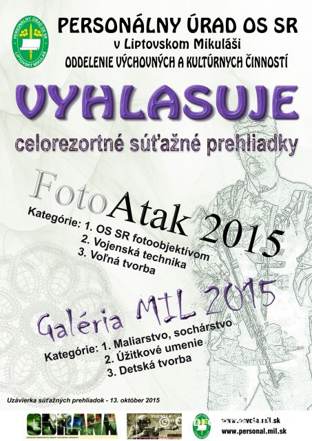 Personálny úrad OS SR v Liptovskom Mikuláši vyhlasuje v roku 2015 dve celorezortné súťažné prehliadky pre profesionálnych vojakov Ozbrojených síl SR, zamestnancov rezortu obrany a ich rodinných príslušníkov. Na rozdiel od predchádzajúcich ročníkov sú v tomto roku vyhlásené dve súťažné prehliadky – FotoAtak 2015 a Galéria MIL 2015. V súťaži FotoAtak je nosnou témou „vojenská technika“. V druhej súťaži môžu súťažiaci prispieť svojimi prácami do kategórií „maliarstvo a sochárstvo“, „úžitkové umenie“ a „detská tvorba“.